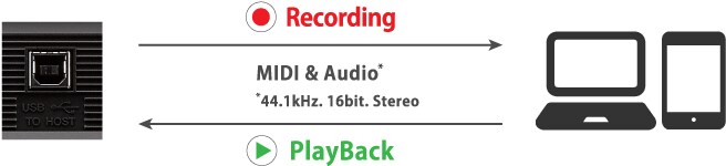 USB TO HOST端子接孔使您可以連接到電腦或攜帶型裝置,錄製高品質音訊而無需額外的介面。另有各種富有創意、及教育意義的iOS應用程式序,在App Store中提供下載。
