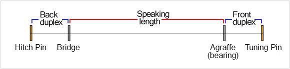 琴弦的設計也豐富了整個聲音。琴橋支撐琴弦的一端,低音與中音的另一端則由定弦器支撐,高音則是由被稱作承軸的部件支撐。在琴弦的兩個支撐元件間的部份被稱為「發聲部分」(speaking length)。在音域正中央位置的A,琴弦會以440赫茲的頻率振動,也就是每秒440次。在高音區,琴弦前方和後方的振動部位分別稱為「前雙重共鳴」(front duplex)和「後雙重共鳴」(back duplex),這些部位會與發聲部分共振,並增加聲音的豐富性。如果沒有共振裝置,聲音就會較貧乏無味。