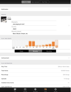 By connecting your MIDI instrument to an iPhone/iPad with the Yamaha i-MX1 cable you can record your daily performances in Piano Diary for later playback to your instrument, exactly as you played. Plus, don’t worry if you lose your iPhone/iPad, as all performance data is automatically stored to the ‘Cloud’ in the Piano Diary servers! Simply log onto Piano Diary with another iPhone/iPad to restore all of your performances!