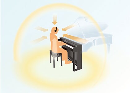 現在,在Clavinova也可以擁有Yamaha先進的雙聲道採樣科技。此科技應用於Yamaha最受讚譽的演奏型平台鋼琴CFX之音源採樣,使用特製麥克風捕捉位置資訊以及其他被人耳忽略的細微差異,創造出來的聲音極為自然、完美環繞,您很快就會忘記自己其實還戴著耳機。