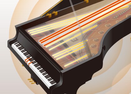 在平台式鋼琴,琴弦與聲音共鳴是來自整體琴身產生的豐富殘響,將聆聽者緊密圍繞。並非僅有您彈奏彈奏的琴弦在震動,而是有其他琴弦隨之發聲,這就是鋼琴聲音如此縝密、豐富的原因。