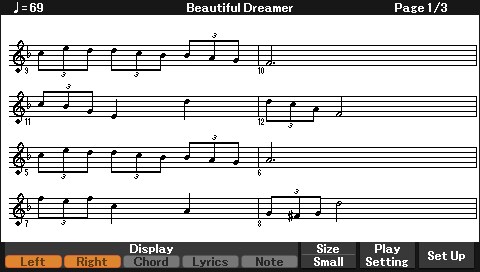 課程功能會在顯示螢幕上顯示音符,是一種有趣的學習和熟悉樂曲的方式。例如,練習右手部分時,左手部分和其他部分的播放將會等待您正確彈奏音符。即使您是初學者,也可以順暢練習旋律和樂句。