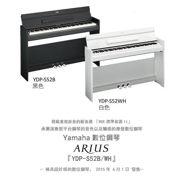 台灣Yamaha與日本Yamaha株式會社於日前6月1日同步發售新款「ARIUS」數位鋼琴YDP-S52。本款承襲了平台鋼琴的音色及觸感、搭載時尚造型,兩款黑白機種型號分別為『YDP-S52B』、『YDP-S52WH』,百搭您的家居設計。