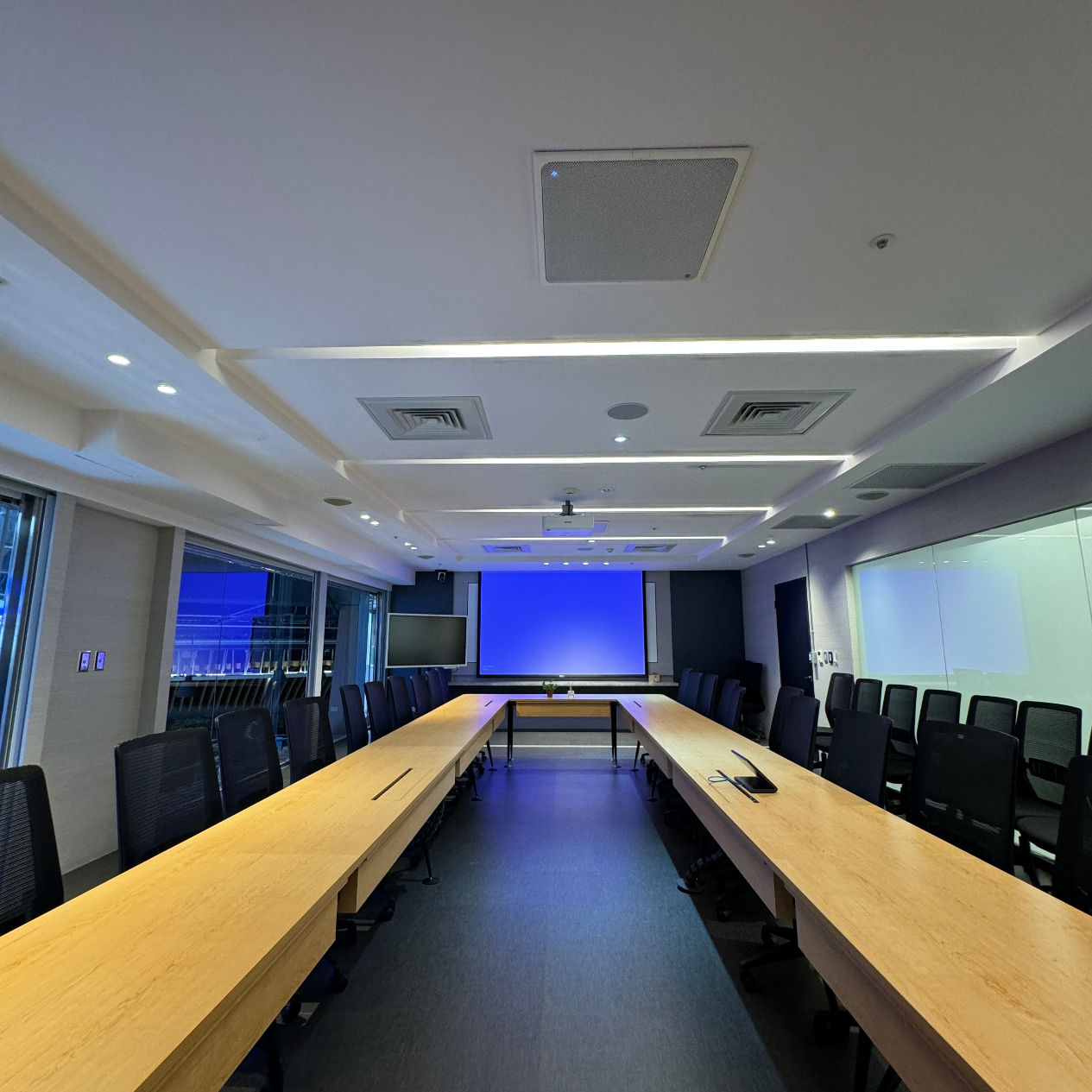 採用Yamaha ADECIA RM-CG陣列麥克風2 pcs作為涵蓋全區的收音系統,搭配Lumens PTZ視訊攝影機、EPSON投影機及TOA的擴音系統,再以Crestron環控系統做為控制中樞,建構便捷的遠端會議系統。