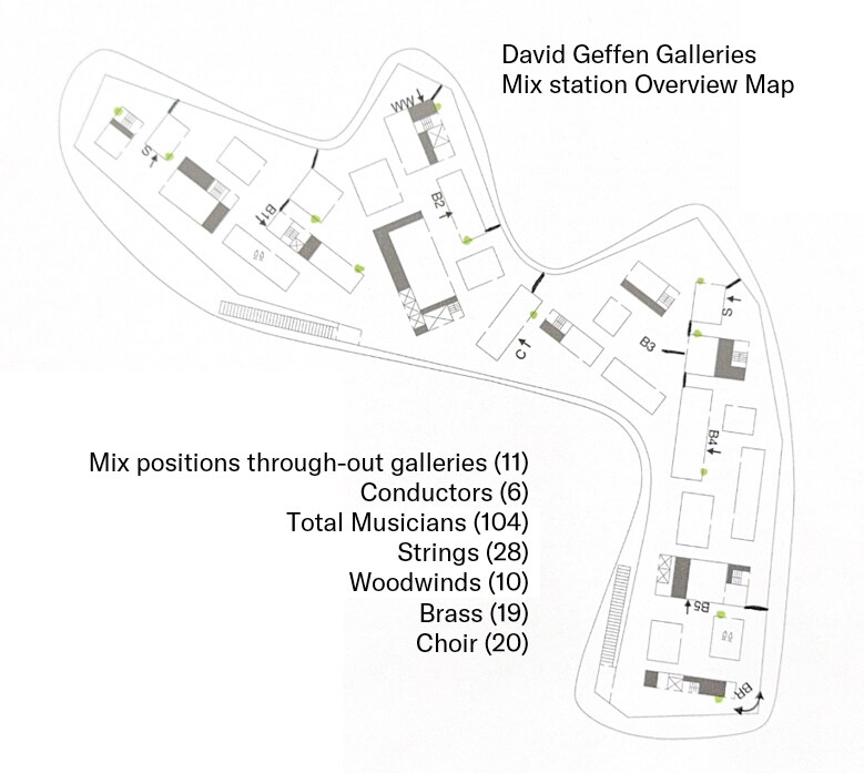 這個創意概念非同尋常又野心勃勃:讓遊客在博物館內自由漫步的同時,可以根據他們所處的位置體驗不同的視聽盛宴。五個混音台都配備完整的樂團組合 — 平台鋼琴、低音提琴、鼓和號角 — 而其他位置則採用弦樂、木管樂器、銅管樂器和 24 人合唱團配置。雖然每個樂團同步演奏同一首樂曲,但聽眾可以依據其在空間中移動路徑,讓聽覺體驗持續變化。