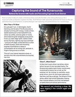 為了管理這種混亂局面,史坦納打造出一台功能強大、方便移動、身處壓力下也能輕鬆操作的設備。其核心是 Yamaha 的 DHR 系列喇叭,特別是 DHR12M 監聽器。小巧但夠力,於是乎成為現場監聽的核心部件,在情況隨時可能變化的製作環境中,仍展現一定清晰度和一致性。「只有混亂兩字可以形容,但又是精彩絕倫的混亂,」史坦納笑著說。「現場配置的 Steadicam 攝影機飛來飛去,演員們口說著台詞,現場樂隊同步演奏,而我正在一旁把這些都錄製下來。」