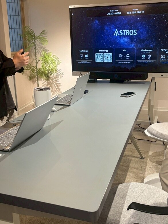 精簡桌面,只留必要:將 ASTROS AS-201 連接螢幕,桌上只保留一顆 Pod,讓投影與發言操作簡單明瞭。