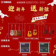 最高享一年份!於2025/1/18–2025/3/31,購買SLG200S靜音吉他/FG/FS紅標吉他/STORIA電木吉他,就送多包Yamaha原廠琴弦!