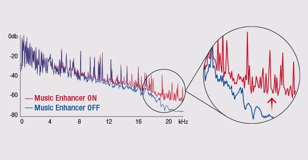 當音樂被編碼至數位壓縮格式如MP3,頻率就會受損。山葉的音樂壓縮加強器透過精細的數位訊號處理技術,以獨家的精算程式恢復所遺失的內容,讓音樂保有原來品質。