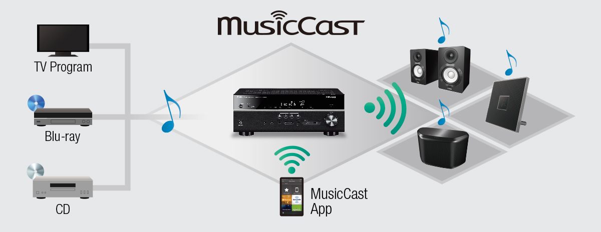 MusicCast透過高效能的無線網路功能傳送音訊,它可以從你的手機、電腦或NAS傳送數位音樂內容到家中任何MusicCast裝置,甚至可以分享連接上RX-V681例如電視或藍光播放器的外部裝置。透過藍牙連接的智慧型手機或平板音訊內容,可以透過MusicCast傳送到不同的房間。