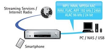 CD 播放器具備網路播放功能,讓您能享受到更豐富的音樂:包括串流服務、其他網際網路音樂內容,到 NAS(網路硬碟)和個人電腦的音樂庫。以網路廣播為例,透過在 Airable 上預選您喜愛的廣播電台(Airable可讓您進入世界各地的 Classic FM 和廣播電台),您可以欣賞各種曲風的音樂,就像在收聽 FM 廣播一樣。另外也可與高解析度 WAV/FLAC/AIFF 192kHz/24-bit 的音訊相容。此外,面板前方具有內建的 USB 插孔,還可以連接到 AirPlay,無限拓展您的音樂世界。