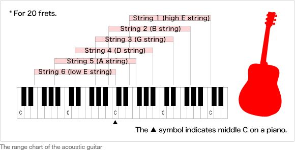 由上往下移動(即從粗到細),音高會愈來愈高。下圖是正常的調音,也就是左手未壓弦時,每條弦發出的音調。