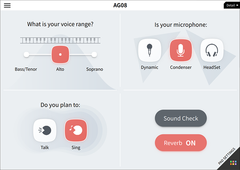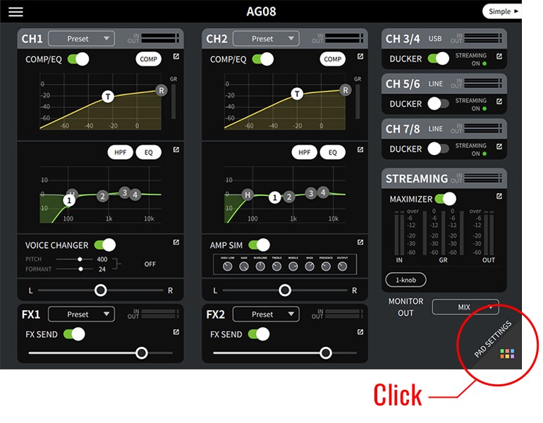 AG08 Controller 是一款 AG08 專用的應用程式軟體,可透過以 USB 連接的 Windows/Mac/iPadOS 裝置控制 DSP 效果和音效鍵等內部功能。
