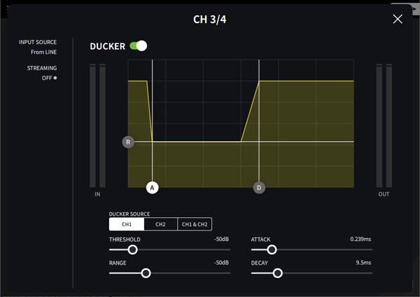 鴨聲器功能可用來根據聲道 1、2 的音訊輸入自動衰減聲道 3/4、5/6 和 7/8 播放的聲音,讓您能夠輕鬆架設一個聲道 1、2 的訊號總是聽得很清楚的直播系統。