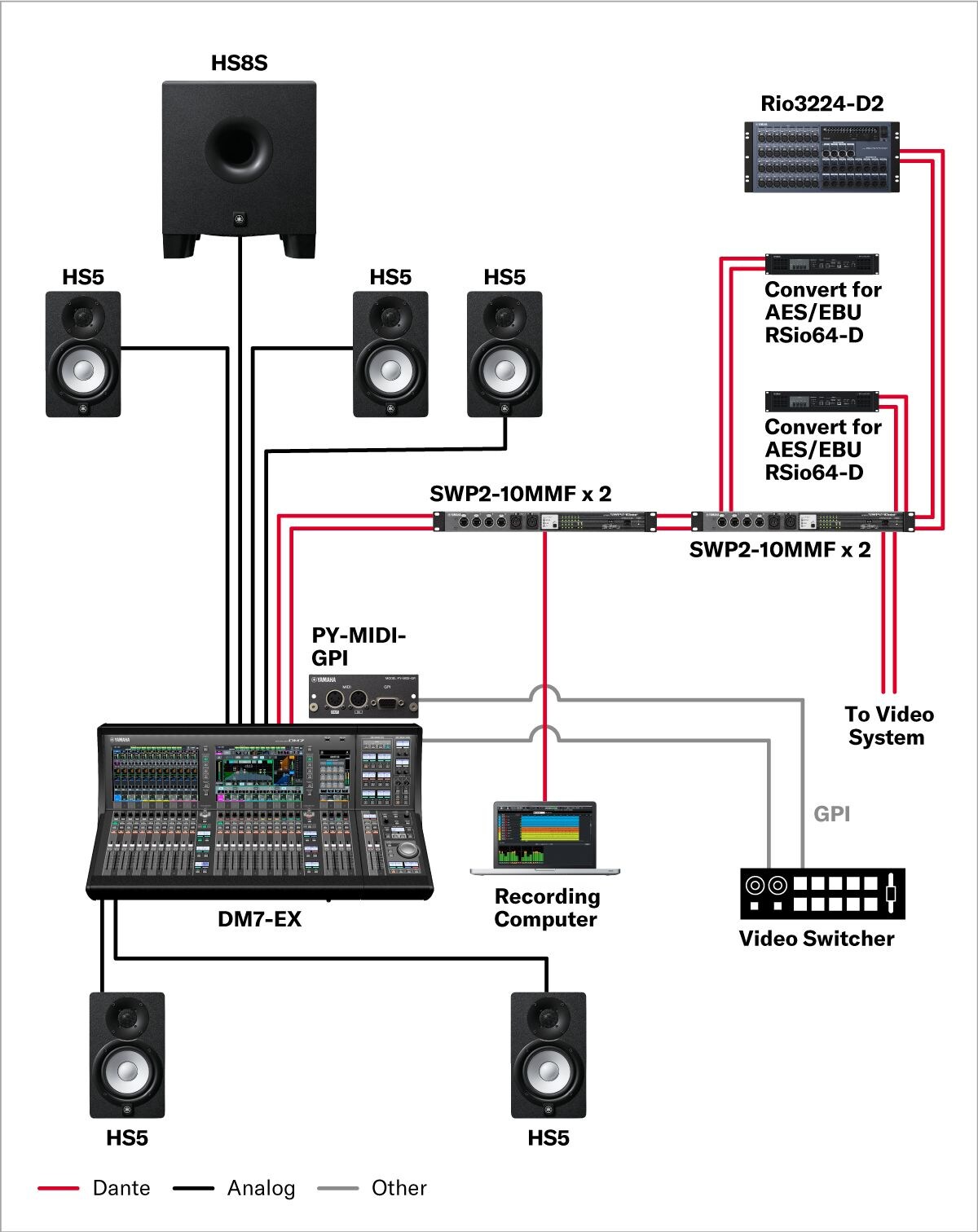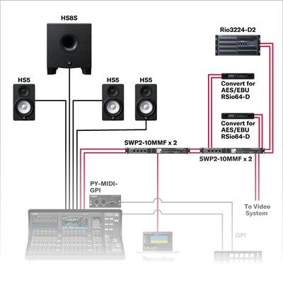 這是主要用於錄製和廣播脫口秀節目的工作室,如廣播錄音室一樣。小巧型 DM3 數位混音器配備許多輸入和輸出。您可以將 DM3 透過 Dante 音訊網路連接到周邊設備,以其為中心,打造靈活且可擴充的系統。