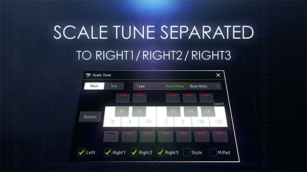 現在,您可以在「音階調整」顯示中,針對每個 Right 1、Right 2 和 Right 3 聲部選擇是否套用音階。