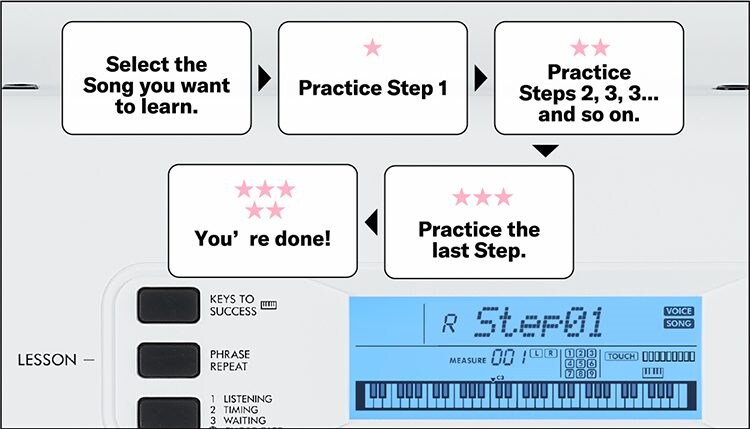 輕鬆彈奏發光琴鍵,即可輕鬆自然,毫不費力欣賞優美的樂音。讓您愛不釋手,無論練習和彈奏時都享有樂趣。而且,如果您想更進一步精進,請依自己的步調,練習三個「課程」功能。分別處理左右手部分,將樂曲分成獨立的部分,方便反覆練習。發光琴鍵可一路引導您,即使您不會讀譜,也可以讓您享有演奏的樂趣。