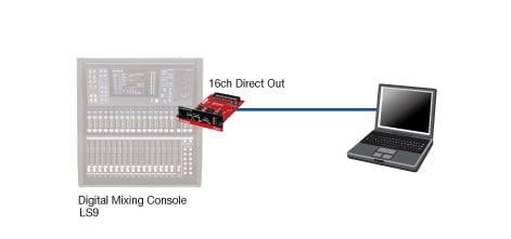 在此圖中,Yamaha LS9 主控台可作為 HA 遠端控制器使用。透過已安裝的 Dante-MY16-AUD 介面卡上的主要乙太網路連接埠,連接至網路交換器。透過 Dante Controller,將 Dante-MY16-AUD 介面卡設定為 HA 遠端模式 2(如需詳細資料,請見 Dante-MY16-AUD 使用指南 v1.23)