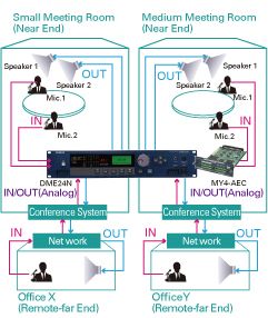 利用 MY4-AEC卡,多位參與者可以在兩個遠端位置的兩個會議室中進行電話會議。