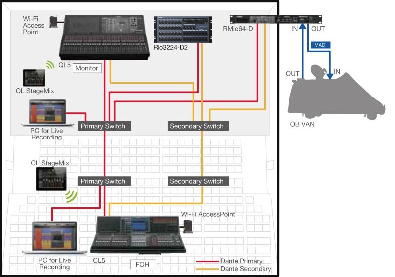 現場音響系統包括在大廳前的 CL 混音座和舞台側端的 QL 混音座。 除了提供監聽混音外,舞台側端 QL 混音座有端口對端口連接的功能可用作 I/O 裝置,而其功能可與 R系列機架組相媲美,從而降低整體系統的尺寸和複雜性。