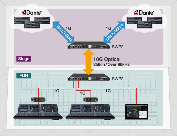 SWP2 系列配置 10G 上行光纖連接埠,即使在取樣頻率設定為 96 kHz 的 Dante 網路上也無需擔心頻寬不足。是一個可擴充的解決方案,可隨 96kHz Dante 網路系統擴展。SWP2-10MMF 包括支援多模光纖的 opticalCON 連接器,SWP2-10SMF 包括支援單模光纖的 opticalCON 連接器。多模和單模型號均可達到更遠的傳輸距離目標。MMF 型號的傳輸距離可達 300 公尺,SMF 型號的傳輸距離可達 10 公里。可以加入 SWP2 系列以允許執行兩條光纖電纜以進行冗餘連線。冗餘連線也支援跨距樹協定 (MSTP)。