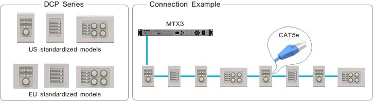 DCP 控制器提供多種功能的彈性外部控制,例如預設呼叫、音量和 SD 卡播放。該系列包括三種不同型號,擁有多種開關和音量旋鈕配置。透過菊鏈連接,將 DCP 控制器連接到 MTX/MRX 系列,最多可連接八個控制面板。所有三種型號皆提供美規或歐規尺寸,目的是符合全球多數地區的規格要求。